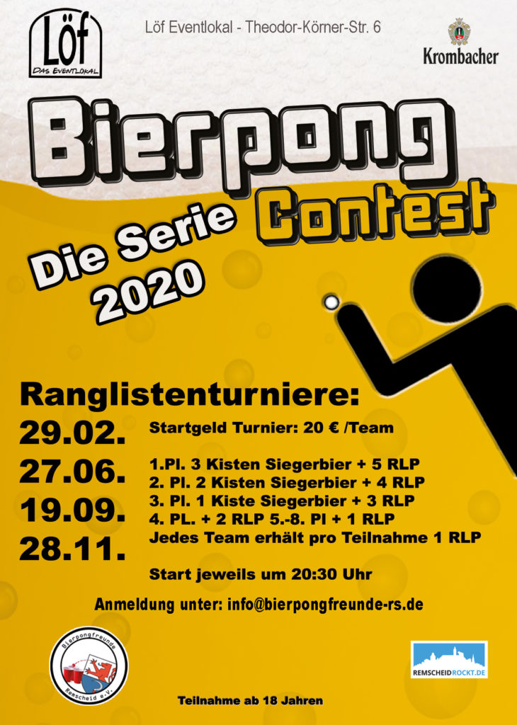 Bierpong Contest - Die Serie 2020 Du kannst einen Tischtennisball in einen Becher werfen ? Dann such dir einen Teampartner, überlegt euch einen kreativen, lustigen, oder einfach einen Teamnamen, der die Gegner schon vor dem Match erzittern lässt, und meldet euch an ! Die Grundregeln sind einfach. Landet der Ball … Bierpong Contest – Die Serie 2020 1. Turnier weiterlesen