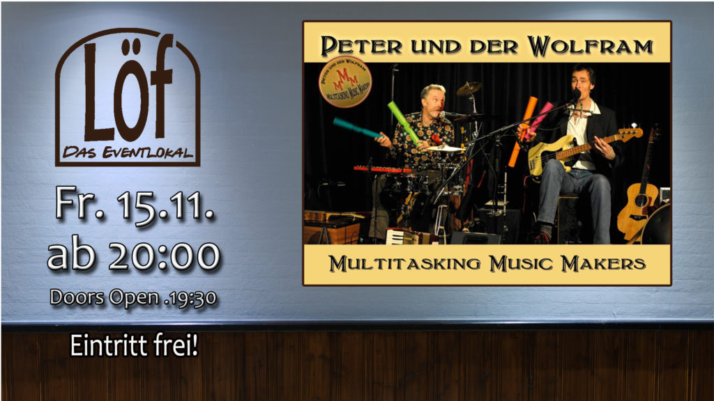 Am 15.11 ab 20 Uhr werden uns Peter und der Wolfram mit ihrem Programm voller Musik und bestem Entertainment begeistern. Peter und der Wolfram MultitaskingMusicMakers Der Sound einer ganzen Band umgesetzt von nur zwei Musikern? Wer sagt, nur Frauen können mehrere Dinge auf einmal machen, Männer hingegen nur eins? Mit … Peter und der Wolfram – Multitasking Musik Makers weiterlesen